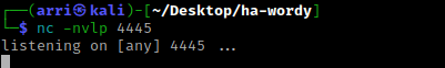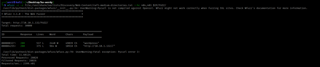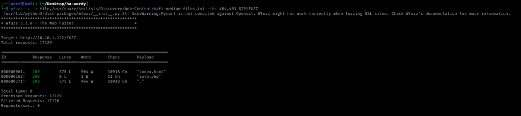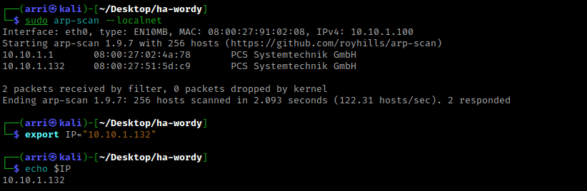 Once I finish this, I check my IP and the IP of the “HA: Wordy” machine using sudo arp-scan --localnet. My IP is the one at the top (10.10.1.100), and the box is the second one on the list (10.10.1.132). Once I figure out the box’s IP, I then set an IP variable using export IP="10.10.1.132". The set IP variable can always be checked by using echo $IP.