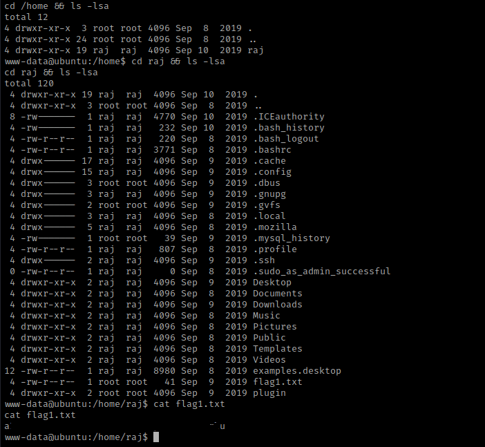 I went back to the site and pasted the payload after “?cmd=”. I looked back at the listener and it was now connected! I then used cd /home && ls -lsa and noticed the user raj. I navigated to that directory and listed the contents using cd raj && ls -lsa and noticed a “flag1.txt”, which I then used cat flag1.txt to read it.