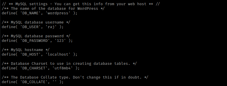 I then used cd /var/ww/html && ls -lsa and noticed a “secret.zip” and WordPress. I decided to come back to the “secret.zip” later and instead cd wordpress && ls -lsa. This showed several different files. After viewing a couple, I used cat wp-config.php, which shows raj’s MySQL password.