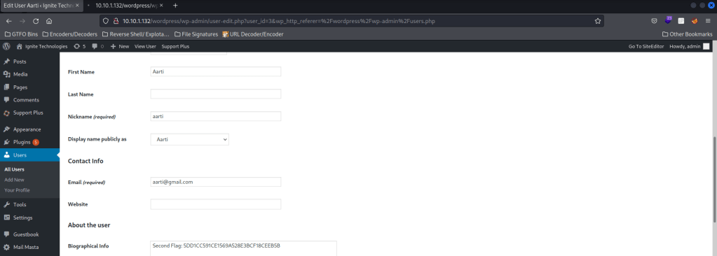 For flag 2, I created another form to upload. Changing the value inside the form method, I called the file “file.html”. It asks for a login and I put “aarti” and it gave me a root password of “SWduaXRlQDEyMw==”, which is in base64 and decodes to “Ignite@123”. This ends up being the admin password on the website (click “Log in” on “/wordpress/”). This then gave me the second flag.