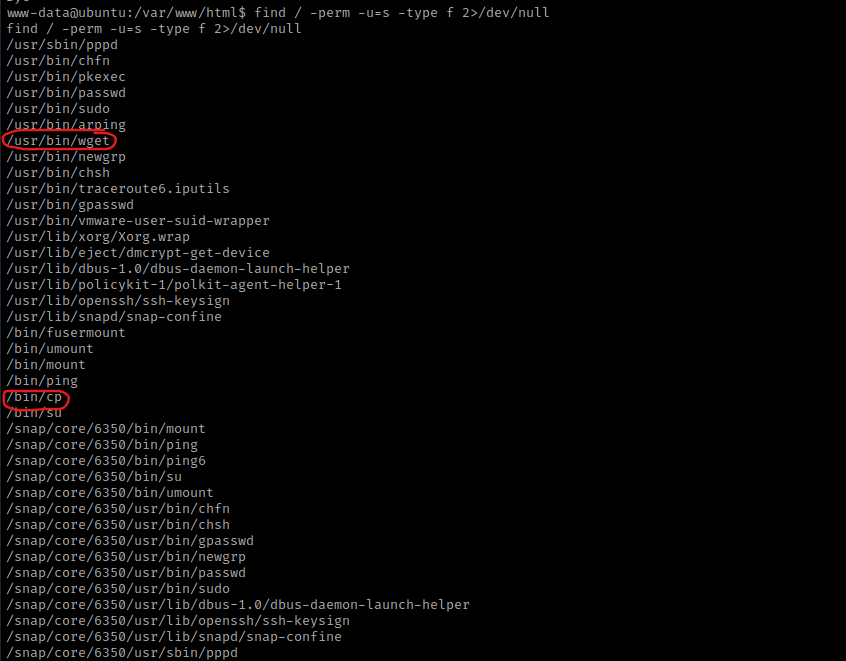 I looked at the kernel version using uname -a and looked at the distribution information using cat /etc/*release. I also checked the environmental variables (using env) and world writeable locations. After this, I checked for things running as root (ie: cron) using ps aux | grep -i 'root' --color=auto and things running on the loopback using netstat -tunlp. These are all things I check normally during post-enumeration. I then checked SUIDs using find / -perm -u=s -type f 2>/dev/null. I noticed “/usr/bin/wget” and “/bin/cp”.