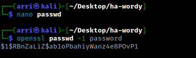 Now I will create my own password file using nano passwd, paste the “passwd” file that I have on the webserver, and add a line to it that will give me root. I created a password hash with the command openssl passwd -1 password.