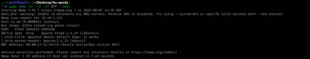I nmaped the target using the IP variable I set up to look at what ports are open using sudo nmap -p- -sC -sV $IP --open. “-p-“ is for scanning all ports; “-sC” is for default NSE scripts; “-sV” is for service versions; and “–open” is for filtering for only open ports. It should return that port 80 (http) is open.