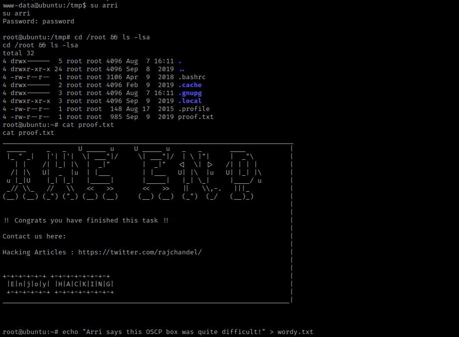 I then used su arri with the password I set, and I was now root! I now used cd /root && ls -lsa and saw the “proof.txt”. I used the command cat proof.txt to get the final flag.