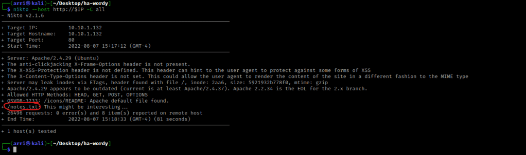 I checked nikto as well using the command nikto --host http://$IP -C all. This brought up “notes.txt”.