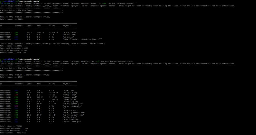 My next step was to use wfuzz to look for other directories (wfuzz -c -z file,/usr/share/seclists/Discovery/Web-Content/raft-medium-directories.txt --hc 404 $IP:80/wordpress/FUZZ/) and files (wfuzz -c -z file,/usr/share/seclists/Discovery/Web-Content/raft-medium-files.txt --hc 404,403 $IP:80/wordpress/FUZZ) on this WordPress site.