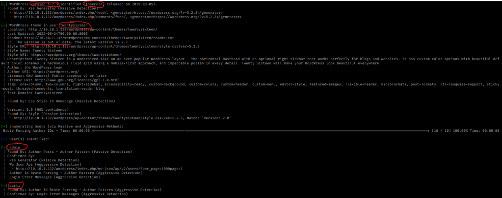 From here I used a wordpress scan to try and enumerate more using the command wpscan --url http://$IP:80/wordpress/ --enumerate p --enumerate t --enumerate u -v. The “p” specifies plugins, “t” specifies themes, and “u” specifies users. This brings back the users admin and aarti, the theme “twentysixteen”, WP-Cron, and that the version of WordPress being used is 5.2.3 (and that it is insecure).