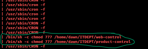 I went back to the terminal to read the information that appeared in this file using cat management.log. This brought up two files in “/ITDEPT” that seemed to have full read, write, and execute permissions for all. The file also mentioned “cron” a lot, which leads me to believe that probably are being executed by a cronjob.