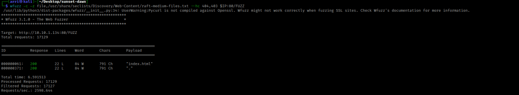 Once I finished this, I checked my IP and the IP of the “Sunset: Dawn” machine using sudo arp-scan --localnet. My IP is the one at the top (10.10.1.100), and the box is the second one on the list (10.10.1.134). Once I figure out the box’s IP, I then set an IP variable using export IP="10.10.1.134". The set IP variable can always be checked by using echo $IP.