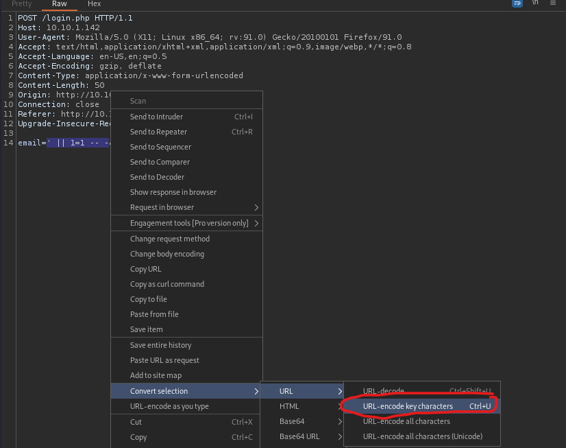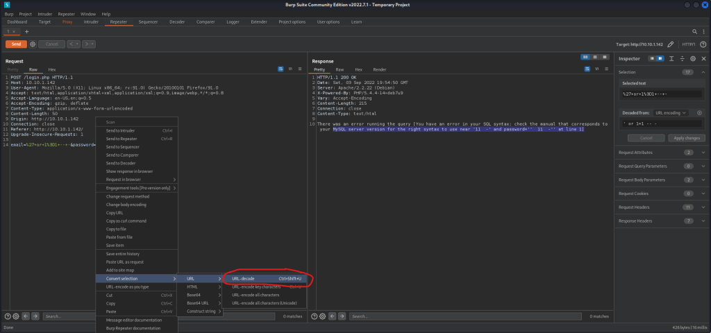 While looking at this error message, I noticed that there might be some SQLi filtering. This is because some of the things that were entered (“or“, “--“, “=“) were not there in the error message. I then had to look for a way to bypass this filtering. I looked back at the repeater I had for Burp and highlighted the green part in password and right-clicked. From here, I navigated and selected “URL decode” (as shown in the image below).