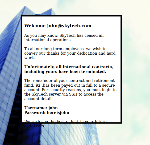 From here, I tried to log in to MySQL with these using the command mysql -uroot -proot (“-u” specfies the user, “-p” specifies the password) and it worked! I used show databases; and use SkyTech;. I then used show tables; and select * from login;. This showed me credentials, which I copied down into my notes.