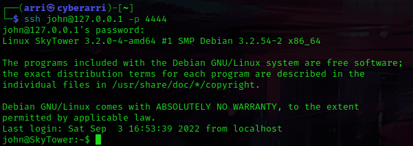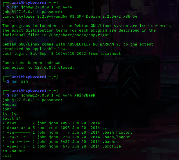 This prompted for a password! I entered the one I had gotten from the web browser and it did not work. I got a bit stuck here and looked around for some possible assistance. I found that I needed to use ssh john@127.0.0.1 -p 4444 /bin/bash and then run ls -lsa and rm .bashrc. I then could use exit and from here, I should be able to ssh in.