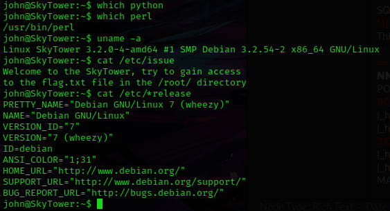 I decided to see if john had any sudo permissions using sudo -l, however he did not. I also looked for some languages that could be on the machine, like python and perl (which python and which perl). The only one that came up was perl. From here, I checked the kernel version with uname -a, the issue file using cat /etc/issue, and the distribution information using cat /etc/*release.
