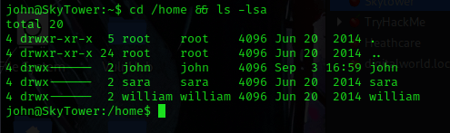 This mentioned that there was a “flag.txt” in the “/root/” directory. I checked several world writeable locations (“/opt”, “/tmp”, “/var/tmp”, etc.). I also checked for processes running as root. I looked around some more on the machine. I eventually used cd /home && ls -lsa and noticed that there were two other users (I put this into my notes).