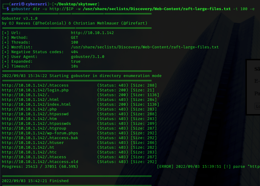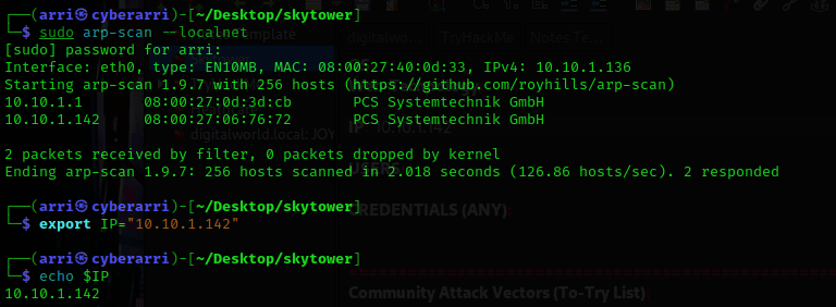 Once I finished this, I checked my IP and the IP of the “Skytower” machine using sudo arp-scan --localnet. My IP is the one at the top (10.10.1.136), and the box is the second one on the list (10.10.1.142). Once I figure out the box’s IP, I then set an IP variable using export IP="10.10.1.142". The set IP variable can always be checked by using echo $IP.