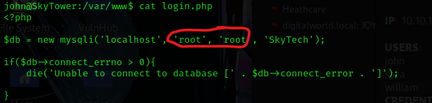 I looked around more and eventually went to cd /var/www and found a “login.php” file. I used cat login.php to view the contents of this and it mentions a SQL database, with the username and password of “root”.
