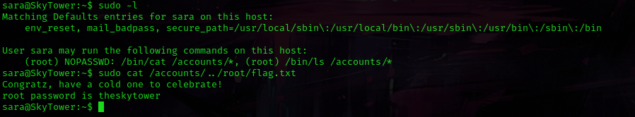 I used sudo -l to check the sudo permissions and noticed that I had permission to run cat /accounts/*. I then decided to try a bit of path traversal so that I could view the contents of flag file. I used the command sudo cat /accounts/root/flag, which runs the command as a sudo user, but rather than choosing a file under accounts, it steps back one and goes into “/root/flag.txt”. Running this command told me the root password!