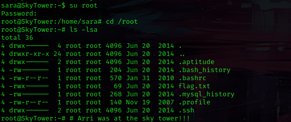 I used su root with the password I had just gotten. I was now root! I then used cd root and then ls -lsa, but I did not see any proof file (I had already viewed the contents of flag.txt).
