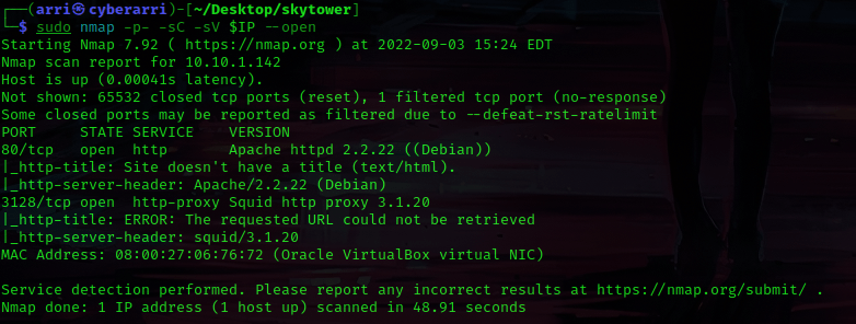 I then nmaped the target using the IP variable I set up to look at what ports are open using sudo nmap -p- -sC -sV $IP --open. “-p-“ is for scanning all ports; “-sC” is for default NSE scripts; “-sV” is for service versions; and “–open” is for filtering for only open ports. It should return that ports 80 (http) and 3128 (http proxy) are open.