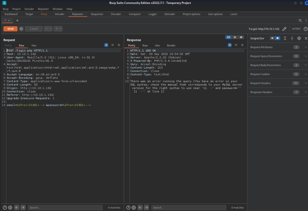 Seeing that it was doing something, I decided to try opening up BurpSuite to see if I could get access to another part of the site that I was not meant to be on. I went back to the normal webpage and used ' or 1=1 -- - as the username and password (another attempt at SQL injection to bypass), I did not submit it yet though. I then went to Burp, made sure “Intercept” was turned on, went back to my browser, turned on my FoxyProxy for Burp, and then hit “Login”. This popped up with an intercept, which I then right-clicked on it and sent it to the repeater. I went to the repeater tab and hit “Send” to see the error this time.