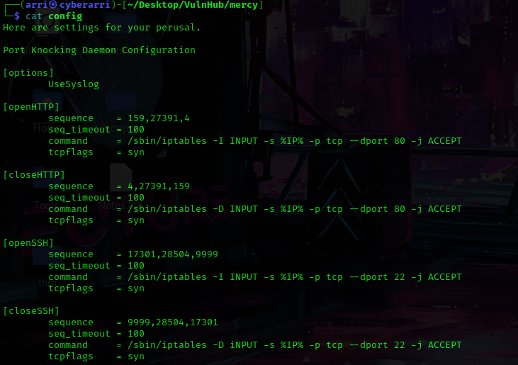I then looked into the files and used cat config. I noticed something very interesting at the top of the file — there is mentions of port 80 and port 22, which did not come up on the nmap scan.