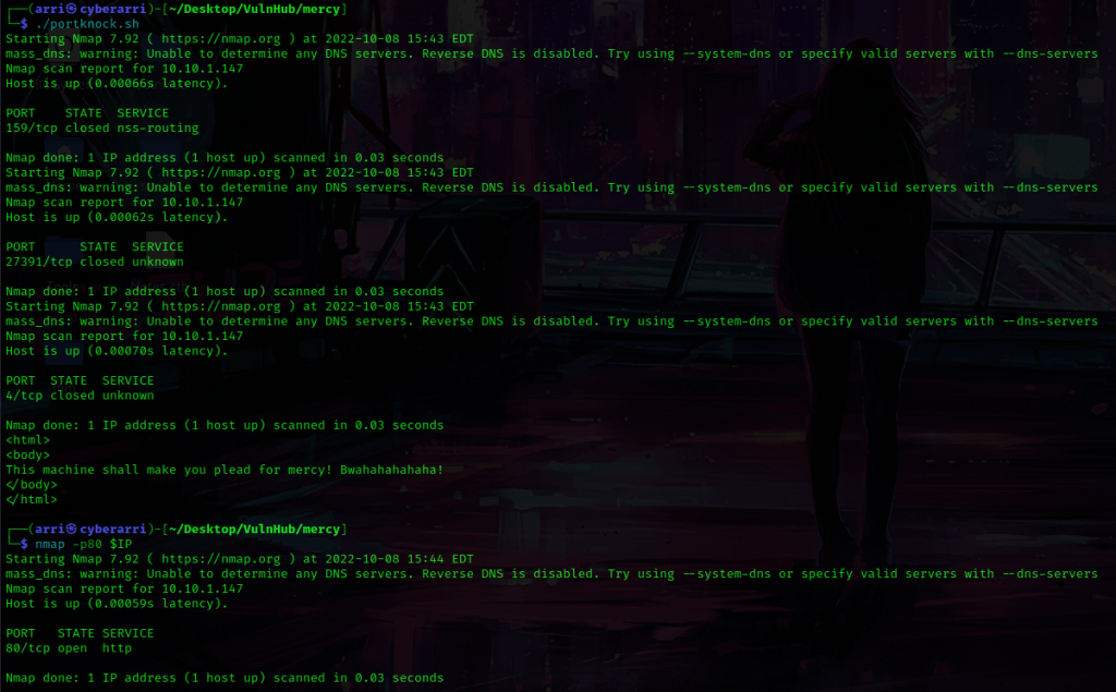 From here, I then used ./portknock.sh to run the file and it worked! I then used nmap -p80 $IP and port 80 is now open!