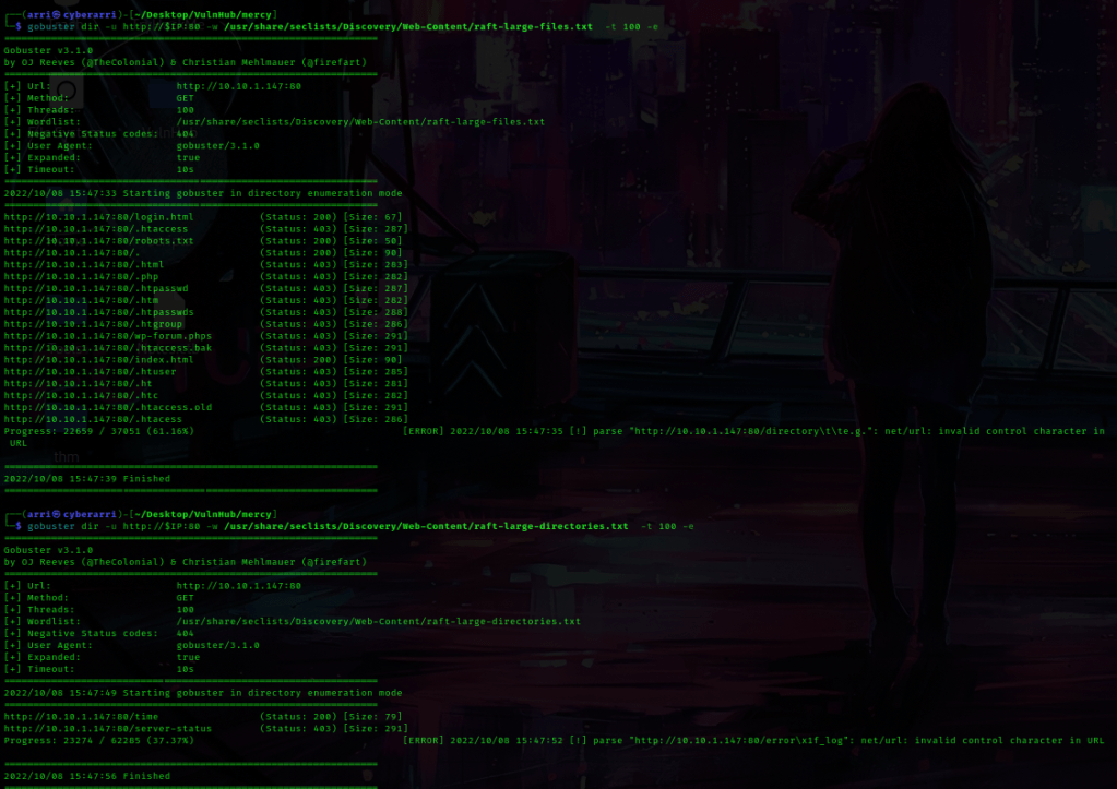 Once I finished this, I checked my IP and the IP of the “Mercy” machine using sudo arp-scan --localnet. My IP is the one at the top (10.10.1.136), and the box is the second one on the list (10.10.1.147). Once I figure out the box’s IP, I then set an IP variable using export IP="10.10.1.147". The set IP variable can always be checked by using echo $IP.