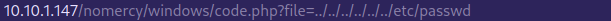 After looking at this file, I noticed that there seemed to be some possible local file inclusion. I copied “/windows/code.php?file=../../../../../../etc/passwd” and pasted it after the “/nomercy/” portion in the browser. This allowed me to view the contents of the “/etc/passwd” file! I copied this URL into my notes incase I could use it later.