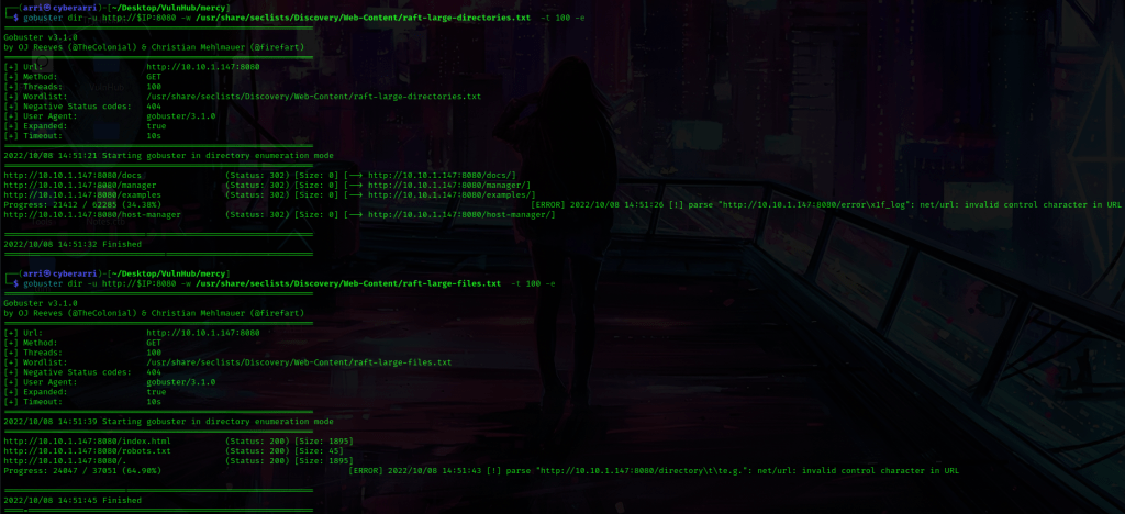From this I learned that “password” could be a possible password for one of the users. I put the above message into my notes and also took note of the possible password. Next, I tried enumerating for some files and directories on the webserver for port 8080 using gobuster. I used gobuster dir -u http://$IP:8080 -w /usr/share/seclists/Discovery/Web-Content/raft-large-directories.txt -t 100 -e to look for directories, and gobuster dir -u http://$IP:8080 -w /usr/share/seclists/Discovery/Web-Content/raft-large-files.txt -t 100 -e to look for files. After looking at these results “/docs/” is the documentation for Tomcat, “/manager/” is a login page (none of the default credentials worked so I wrote this down to come back to later), “/examples/” was really nothing important, and the files only brought up things we knew about before (an index page and “/robots.txt”).