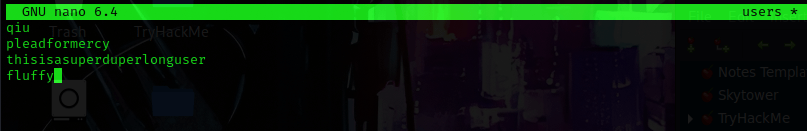 Next, I ran enum4linux -a $IP to look for null SMB sessions to try to find users. This came back with a few users. I used nano users to input the users into the file incase I would need it later. I saved the file once I was done.