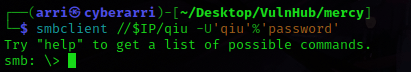 I used run and got that qiu has a password of “password”. I then typed exit to get out of msfconsole. I then logged into the smbclient using smbclient //$IP/qiu -U'qiu'%'password'.