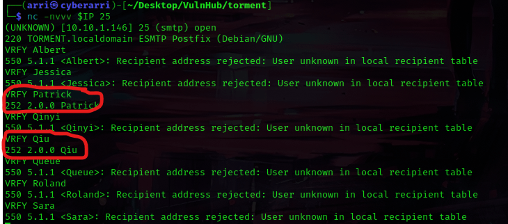 I decided to try logging onto the smtp port to see if I could verify any of the names I had just gotten. I used the command nc -nvvv $IP 25 to connect. Then to try verifying, I used the command VRFY <user>, except replacing <user> with one of the user’s names. From this, I learned that Patrick and Qiu were the only valid users on that list.