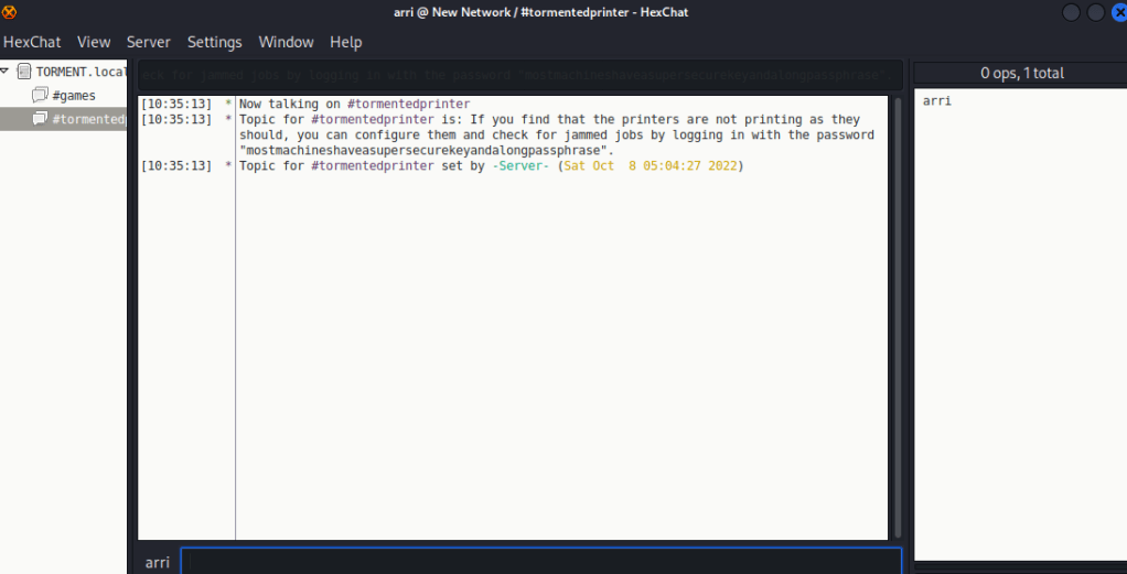 To join the channels (in the IRCd client), I used /join #<channel name>. I looked at “games”, but there was not much. However, when I looked into “tormentedprinter”, there was something strange about the topic. It seemed like it gave a possible passphrase for the id_rsa that was needed.
