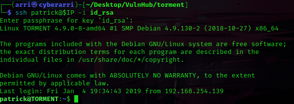 I got out of this using Ctrl+C and then used ls -lsa to make sure that I had all of the files I had gotten earlier. I decided to use chmod 600 id_rsa to change the permissions on the “id_rsa” key. From here, I used ssh Patrick@$IP -i id_rsa to try to log in using the rsa key. This prompted for a passphrase (which I did not have), so I used Ctrl+C to exit out. I tried qiu as well, but this still required a passphrase.