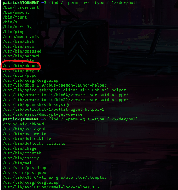 I looked at SUIDs (find / -perm -u=s -type f 2>/dev/null) and GUIDs (find / -perm -g=s -type f 2>/dev/null) there was not much, but I did take note of “/usr/bin/pkexec”.