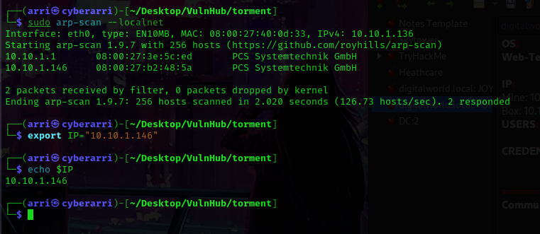 Once I finished this, I checked my IP and the IP of the “Torment” machine using sudo arp-scan --localnet. My IP is the one at the top (10.10.1.136), and the box is the second one on the list (10.10.1.146). Once I figure out the box’s IP, I then set an IP variable using export IP="10.10.1.146". The set IP variable can always be checked by using echo $IP.