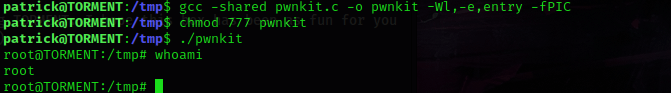 I then compiled this using gcc -shared pwnkit.c -o pwnkit -Wl,-e,entry -fPIC. Once this was complete, I changed the permissions once it was complete using chmod 777 pwnkit and then executed the file using ./pwnkit. I then used whoami and it told me that I was root!