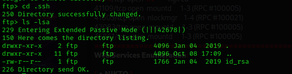 From this nmap scan, I noticed that port 21 (ftp) allows anonymous login. I typed in ftp $IP 21 and then typed the username as “anonymous” and nothing for the password. I was logged in! I used ls -lsa to view the contents and noticed a “.ssh”, so I used cd .ssh to go into that folder. To view the contents of that folder, I used ls -lsa.