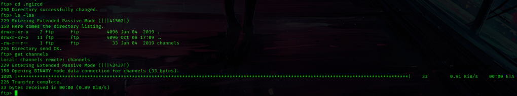 After noticing the “id_rsa” file, I used get id_rsa to get it to the directory on my machine. Once this was complete, I went back to the main directory using cd .. and then ls -lsa to view the contents. I looked through a bunch of folders, but eventually used cd .ngircd. After looking around, this was the only area left that looked a little interesting. I used ls -lsa to view the contents of the folder and then I used get channels to get the only file that was in this folder.