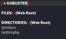 I went back to the terminal and ran a gobuster scan on the normal webserver (on port 80), but not much came up. I then decided to run a gobuster scan on the cups webserver on port 631 using the command gobuster dir -u http://$IP:631 -w /usr/share/seclists/Discovery/Web-Content/raft-large-directories.txt -t 100 -e. This brought up a lot, but the ones that stood out were “/printers” and “/adminPHP”.