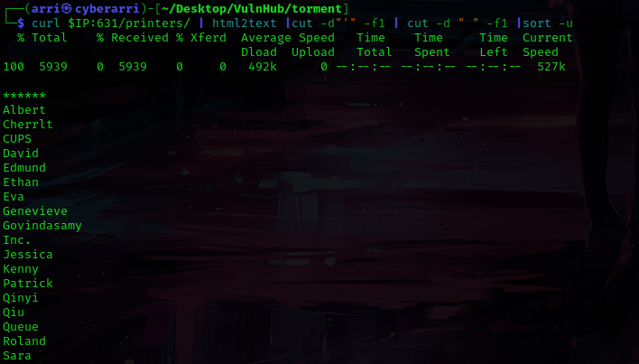 From here, I tried to get the users separated from the output of the printer page by using the command curl $IP:631/printers/ | html2text |cut -d"'" -f1 | cut -d " " -f1 |sort -u. This gave me a list of possible users for the id_rsa key I had gotten earlier.