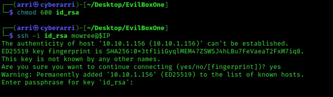 From here, I changed the permissions on the id_rsa key to be only read and write for myself (which are the proper permissions for this type of file) using the command chmod 600 id_rsa. Once this was done, I proceeded to attempting a login with the command ssh -i id_rsa mowree@$IP. The “-i” allows me to specify an id_rsa key to log in with. Once I had executed this command, it asked for a passphrase, which is something that I did not have and meant that I could not log in with the id_rsa key alone.